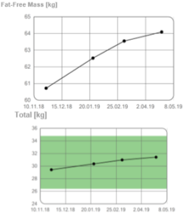 שינוי הרכב גוף בצורה איכותית : ירידה של 4 ק"ג ממסת השומן ועליה של 1 ק"ג במשקל הרזה